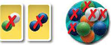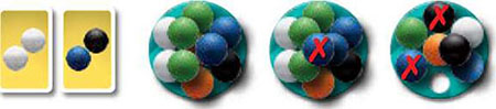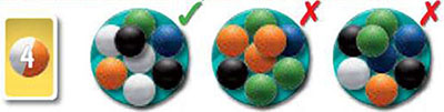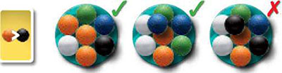 If spheres of both colors indicated on the card are placed on the tray, each of these spheres must touch at least one sphere of the other color (side by side or on top of each other).