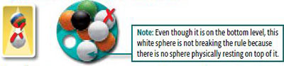 The solid-colored sphere shown on the card must not be placed underneath other spheres such that the other spheres are physically resting on top it. The sphere shown may be located on any level as long as there is nothing physically resting on top of it.