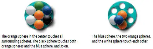 In this example, white and green spheres must not touch each other, and blue spheres must not touch each other Note: The white and green spheres on level two do not touch each other!