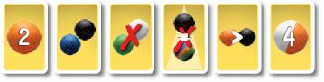 Player A has completed all tasks indicated on the cards, except for the task "The combined total number of spheres in both colors (orange and white) must be exactly four". He discards two point tokens. Since he didn't complete all tasks indicated on the six task cards correctly, he cannot receive a bonus token.