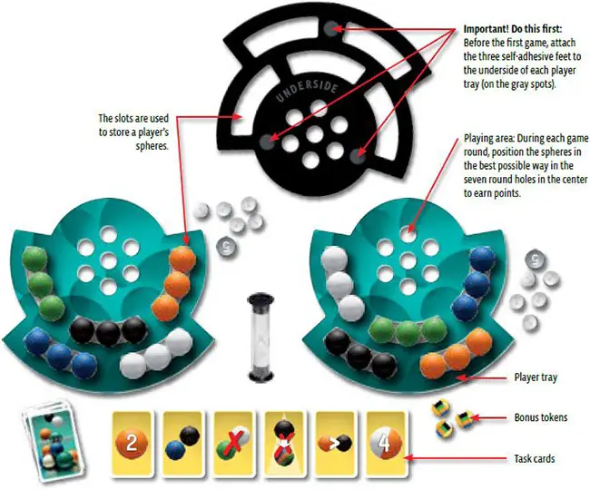 Each player takes 15 spheres. Place three spheres of each color (orange, blue, green, black, and white) in the five slots in your tray. Do not fill the round holes yet. (In a game with fewer than four players, the remaining spheres remain in the box; they are not required).