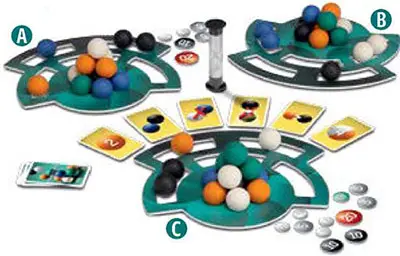 While the hourglass runs down, all players try to complete the tasks and position the spheres correctly on their own trays.