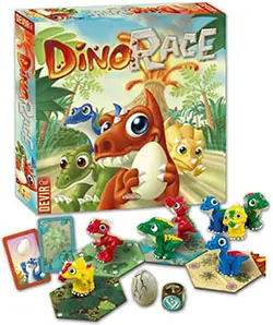 Each player must bring his dinosaur couple to the end of the race track. When one of your dinos finishes the race, you receive a prize counter, scoring points. You also score points if you bring the egg to safety. The player with most points wins.