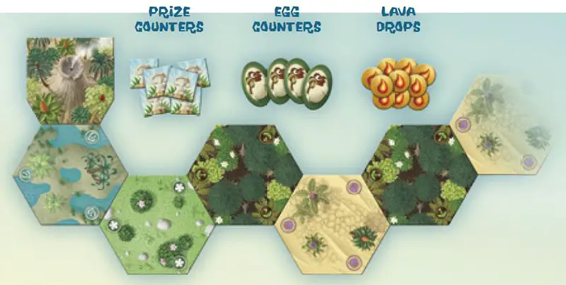 Finally, draw a number of prize counters equal to the number of dinos in the race, to form a stack. The other prize counters are put back in the box, without looking at them. Set aside the event die, egg counters, and the lava drops - you'll need them later!