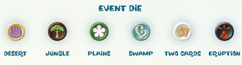 Terrain: Four sides of the die show a terrain type. Each player draws one card from the deck for each dino he has on that terrain type.