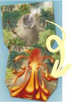 The volcano erupts: Trouble for your dinos! When you roll this result, the volcano erupts and lava flows. During the game, the eruption will form a lava river, starting from the volcano tile and filling the race track! Two different things happen: