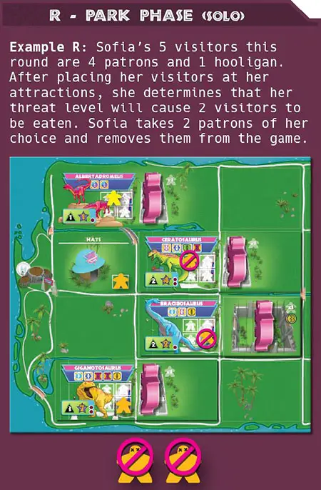 Play as normal, with the following addition: At the start of each research phase, reveal the top card of the Al deck. At the bottom of the card, you will find Icons that tell you which dice to remove from play this round, as well as which dino recipes, attractions, lab upgrades, and specialists to discard (If any).