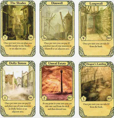 Every area on the board has a City Area card. Each card grants you a particular ability. In most cases you can use this ability once per turn and you choose when you wish to use it.
