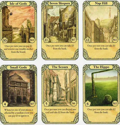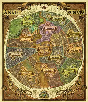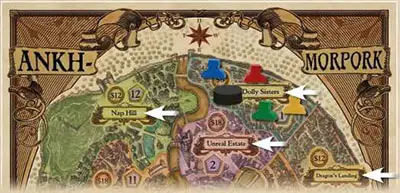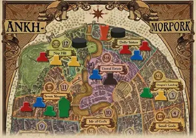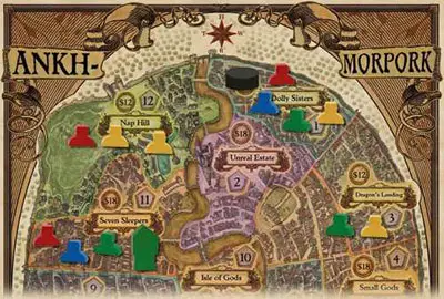 The board shows the city of Ankh-Morpork. The city has been divided into twelve areas. Each area is bordered either by a line or the River Ankh.