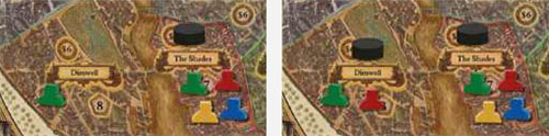 Example: Here is an example of what happens when you place a minion in an area that already contains a minion. The picture to the left shows the /board before you have your turn, the one on the right after you've had it. As there was already a minion in Dimwell you must also place a trouble marker in the area.