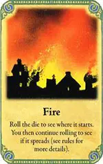 Roll the die to establish the area of the fire. If there is no building in the rolled area then the random event ends without effect. If there is a building in the area then remove it from the board and roll the die again.