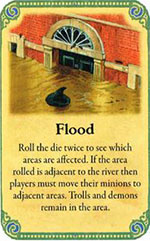 Roll the die three times and place one troll piece in each area of the same number. More than one troll can end up in an area. Remember to place a trouble marker if there is already one or more minions in the area.