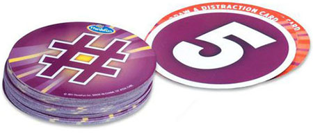 Choose to play using either the purple questions or the blue questions on the Distraction Cards. The two colors provide variety. If you play your first game using the blue questions, mix it up by using the purple questions during your next game.