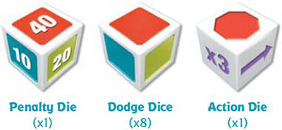 Dodge Dice: The eight Dodge dice match the colors of the Penalty die. Take turns rolling the remaining Dodge dice and putting aside any that land on the same color as the Penalty die.