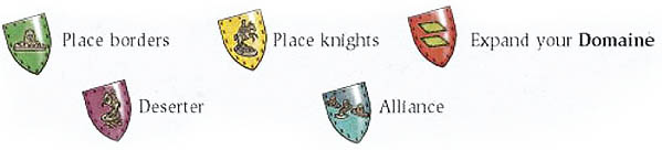 This action allows you to force a knight to change sides! Select any one of your Domaines, and an adjacent one that belongs to an opponent. Both Domaines must have at least one knight in them. A knight then changes sides between those two Domaines. Choose one of your opponent's knights. He must return that knight to his supply.