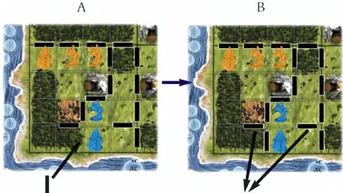 Example: Orange places a border to create 2 Domaines A. Orange gains 7 victory points, Blue only one. The two extra borders in the Domaine are removed B.