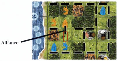Example: Alter the alliance is formed, Orange may not expand into the lower Domaine controlled by Blue. However Orange may still expand into Blue's Domaine on the right since no alliance exists between these two areas.
