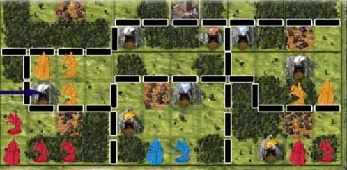 Example: Blue created a Domaine with a village, a forest, and a mine in the right comer using only 6 borders. Orange is still 2 borders short of enclosing a Domaine Red does not control a Domaine.
