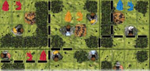This example shows a legal starting position. Castles of the same color are at least 6 spaces apart and are on meadows. Knights are on meadows or forests.