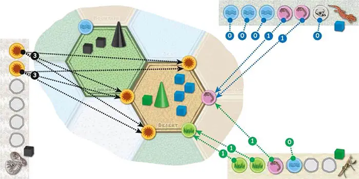 Note that with three water the amphibians would dominate the savannah (3 to 2) if they were to move there. Note also that if the sun element sitting on both these tiles were to be removed the reptiles would be endangered in the savannah, as they would no longer match any elements there.
