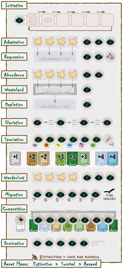 Players will usually want to check to see if any animals have gained or lost dominance at the conclusion of those actions affecting placement or removal of elements-the Adaptation or Depletion actions, for example.