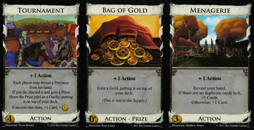 This set also introduced Prize cards. There is a set of 5 unique Prizes that are kept away from the Supply pile and you can not buy or gain them through any Action other than the Tournament card.