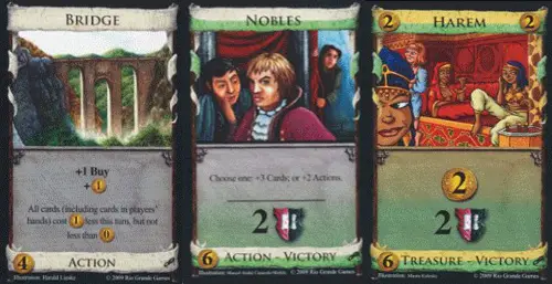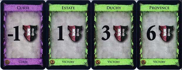 Victory cards will be added to your deck when purchased, but will have no value until the game ends and all players add up the total number of Victory Points printed on their Victory cards. The player with the most Victory Points at the end of the game is the winner. This introduces an interesting dilemma.
