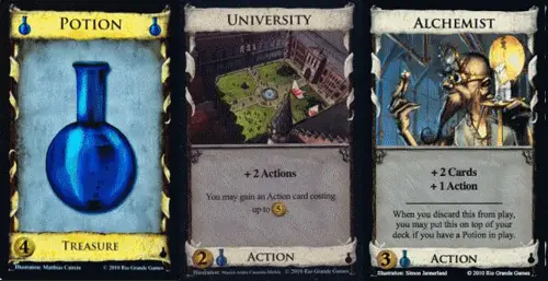 Alchemy is one of two smaller expansions for Dominion with only 12 new Kingdom Cards. A new type of Treasure was added to fit the theme called Potions.