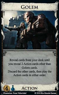 Golem![]() | Action | $4 + 1P | Reveal cards from your deck until you reveal 2 Action cards other than Golem Cards. Discard the other cards, then play the Action cards in either order |