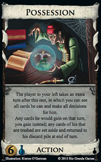 Possession![]() | Action | $6 + 1P | The player to your left takes an extra turn after this one, in which you can see all cards he can and make all decisions for him. Any cards he would gain on that turn, you gain instead; any cards of his that are trashed are set aside and returned to his discard pile at end of turn |