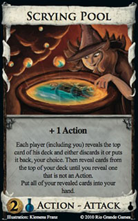 Scrying Pool![]() | Action - Attack | $2 + 1P | +1 Action Each player (including you) reveals the top card of his deck and either discards it or puts it back, your choice. Then reveal cards from the top of your deck until revealing one that isn't an Action. |