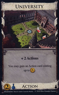University![]() | Action | $2 + 1P | +2 Actions You may gain an Action card costing up to 5 Coins. |