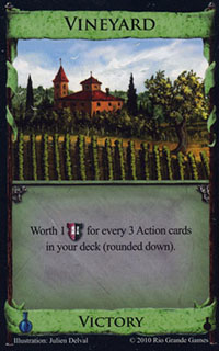Vineyard![]() | Victory | 1P | Worth 1 Victory for every 3 Action cards in your deck (rounded down) |