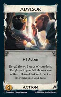 Advisor![]() | Action | 4 Coin | +1 Action Reveal the top 3 cards of your deck. The player to your left chooses one of them. Discard that card. Put the other cards into your hand |