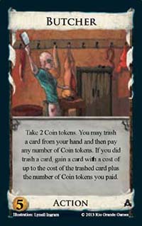Butcher![]() | Action | 5 coin | Take 2 Coin tokens. You may trash a card from your hand and then pay any number of Coin tokens. If you did trash a card, gain a card with a cost of up to the cost of the trashed card plus the number of Coin tokens you paid |