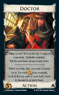 Doctor![]() | Action | 3+ Coin | >Name a card. Reveal the top 3 cards of your deck. Trash the matches. Put the rest back on top in any order. When you buy this, you may overpay for it. For each $1 you overpaid, look at the top card of your deck; trash it, discard it, or put it back |