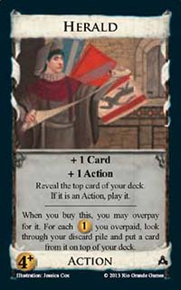 Herald![]() | Action | 4+ Coin | +1 Card +1 Action Reveal the top card of your deck. If it is an Action, play it. |
