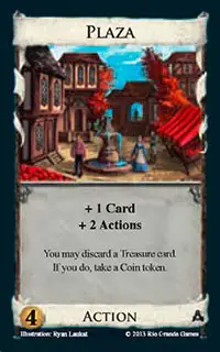 Plaza![]() | Action | 4 Coin | +1 Card +2 Actions You may discard a Treasure card. If you do, take a Coin token |