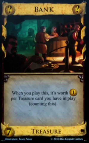 Bank![]() | Treasure | $7 | Worth ? Coins. When you play this, it's worth $1 per Treasure card you have in play (counting this) |