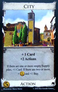 City![]() | Action | $5 | +1 Card +2 Actions If there are one or more empty Supply piles, +1 Card. If there are two or more, +$1 and +1 Buy |