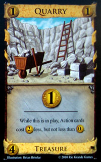 Quarry![]() | Treasure | $4 | Worth 1 Coin. While this is in play, Action cards cost $2 less, but not less than $0 |