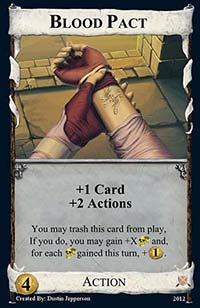 When you play this, first draw a card. While Blood Pact is in play on the table, you may trash it. If you do, you may choose to gain any number of curse tokens. You must trash Blood Pact to use the effect: for each
