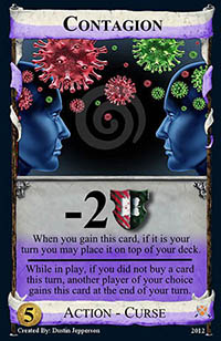 Contagion can either be purchased (from the available Kingdom Cards) or gained from the Curse Deck as a result of gaining a curse from another card and/or action. If purchased or otherwise gained during your turn (including gaining a curse as a result of a lost Warrior Battle for which you were the attacking player), you may choose to either place Contagion on the top of your draw deck or face up in your discard pile. However, if you gain Contagion from the Curse Deck during another players turn (e.g. losing a Warrior battle), you must place the gained Contagion card face up on the top of your discard pile, as normal. Either way, when you gain Contagion you must resolve the life point effects (i.e. lose two life points).