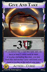 This card can only be gained from the Curse Deck as a result of another card or action (it cannot be purchased). If you play Give And Take as an Action, place it in play using an available action. Then at the end of your turn, if you did not buy a card this turn AND you have at least one other Curse card in your hand or in play (other than the Give And Take card), you may trash the Give And Take card and 1 other Curse card.