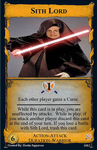 Now you see that evil will always triumph, because good is dumb. While Sith Lord is the least powerful Warrior Card (strength = 1), and therefore loses all Warrior battles, he makes up for it with strong force power. If you play Sith Lord and another player plays any other Warrior Card as a Reaction, thus forcing a Warrior battle, you must immediately trash Sith Lord in addition to resolving any penalties from losing the Warrior battle (e.g. gaining a Curse card).