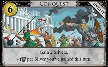 This counts the two Silvers it gives you (provided that there were Silvers left to gain). For example, with 12 coins and 2 Buys and having gained no Silvers earlier in the turn, you could buy Conquest twice, getting two Silvers, then +2