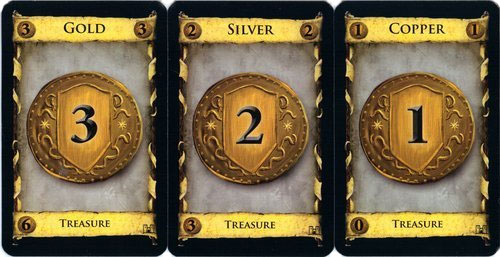 Players will use the Treasure cards multiple times during the game. They are discarded during the Clean-up phase, but the player will draw them again after his Discard pile is shuffled into a new Deck. Thus, Treasure cards can be viewed as a source of income, not a resource that is used up. When played, Coppers are worth 1 coin, Silvers, 2 coins, and Golds, 3 coins.