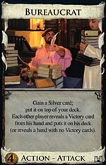 Actie – Attack | $4 | Verkrijg een zilver kaart; Steek dus op de top van je stapel. Elke andere speler onthult een overwinningskaart van zijn hand en stopt deze in zijn dek. |