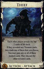 Actie – Attack | $4 | Elke speler toont de 2 bovenste kaarten in zijn dek. Als het treasure kaarten zijn, wordt 1 ervan opgeruimd. Je ontvangt 1 of al deze opgeruimde kaarten. |