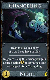 When you play Changeling, you trash it and gain a copy of a card you have in play; that can be any card you have in play, including Actions, Treasures, and Night cards, and including Duration cards you played on a previous turn that are still in play.